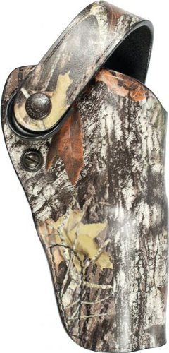 Now available in camo, the Dual Action Outdoorsman holster is great for field carry whether hunting or for peace of mind in bear country. The DAO can be worn strong side or crossdraw at the user’s discretion. The holster employs a retention strap for simplicity and security in the brush. The retention strap has a large polymer tab to aid in snapping and unsnapping with a gloved hand. Tension screw adjustments allow for a custom fit to your revolver. Constructed of premium saddle leather, the DAO fits belts up to 1 3/4". Made for double-action revolvers, the Dual Action Outdoorsman is available in right hand designs in Mossy Oak Breakup.